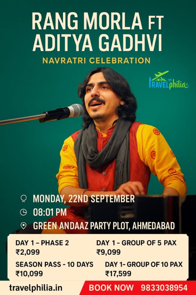 Navratri is not just a festival—it’s an emotion that brings people together with dance, devotion, and dazzling celebrations. This year, Travelphilia brings you exclusive Navratri events in Ahmedabad, featuring some of Gujarat’s most loved and celebrated artists: Aditya Gadhvi, Geeta Rabari, and Kirtidan Gadhvi.